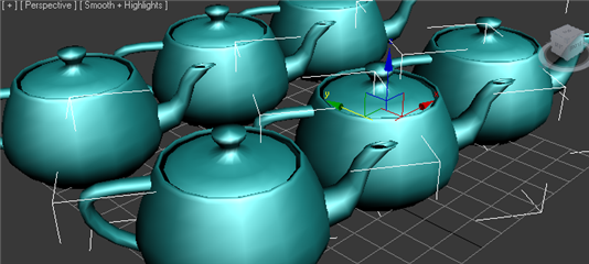 - Hold down a shift key on the keyboard, and drag the red arrowhead of the move gizmo to the right: notice that the teapot is being copied.