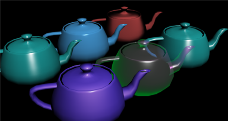 - Pick two of the remaining shader types for the remaining teapots. Again, modify the settings, colors, etc., and record the values you used. Save the file when done. As I will demonstrate in class, render one frame to see the actual appearance of your shaders. The appearance in the viewport is only an approximation.